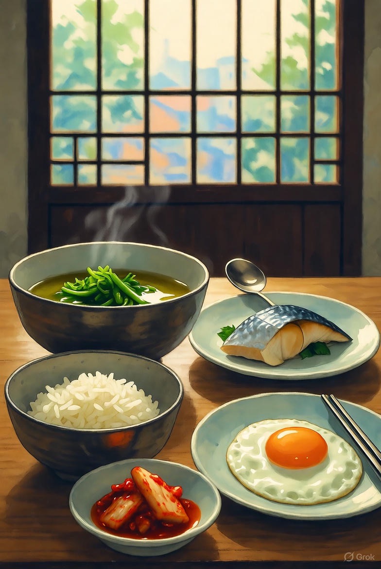 With a light breakfast, often rice, soup, and side dishes before heading to school or work.