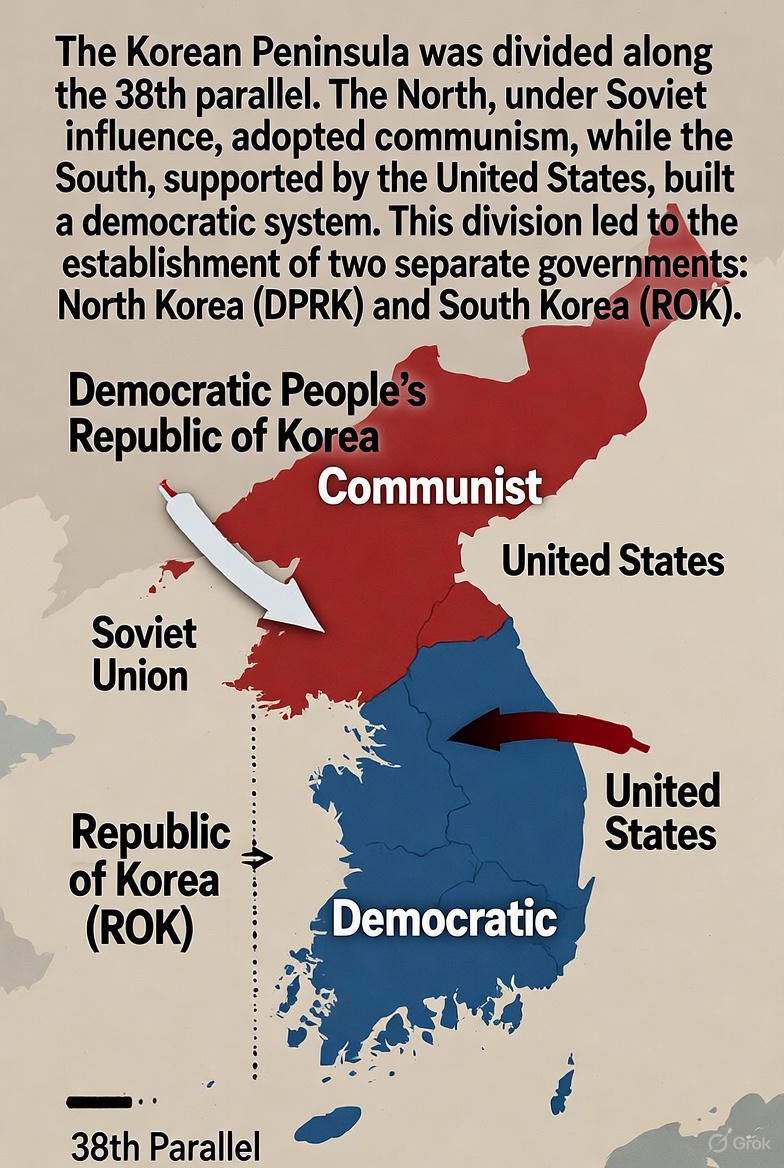 After liberation from Japan, the Korean Peninsula was divided along the 38th parallel. The North was occupied by the Soviet Union and adopted communism, while the South was supported by the United States and built a democratic system. This division created two separate governments: North Korea (DPRK) and South Korea (ROK).