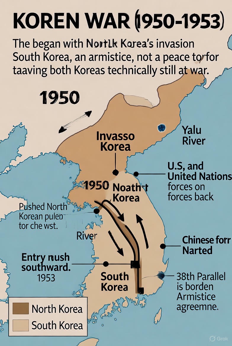 War broke out when North Korea invaded South Korea in 1950. The conflict involved the U.S. and UN forces supporting the South, while China backed the North. The war ended in an armistice, not a peace treaty — leaving both Koreas technically still at war today.