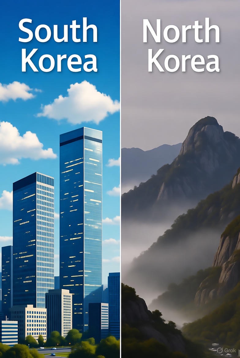 South Korea is democratic and advanced; North Korea is isolated and under a dictatorship.