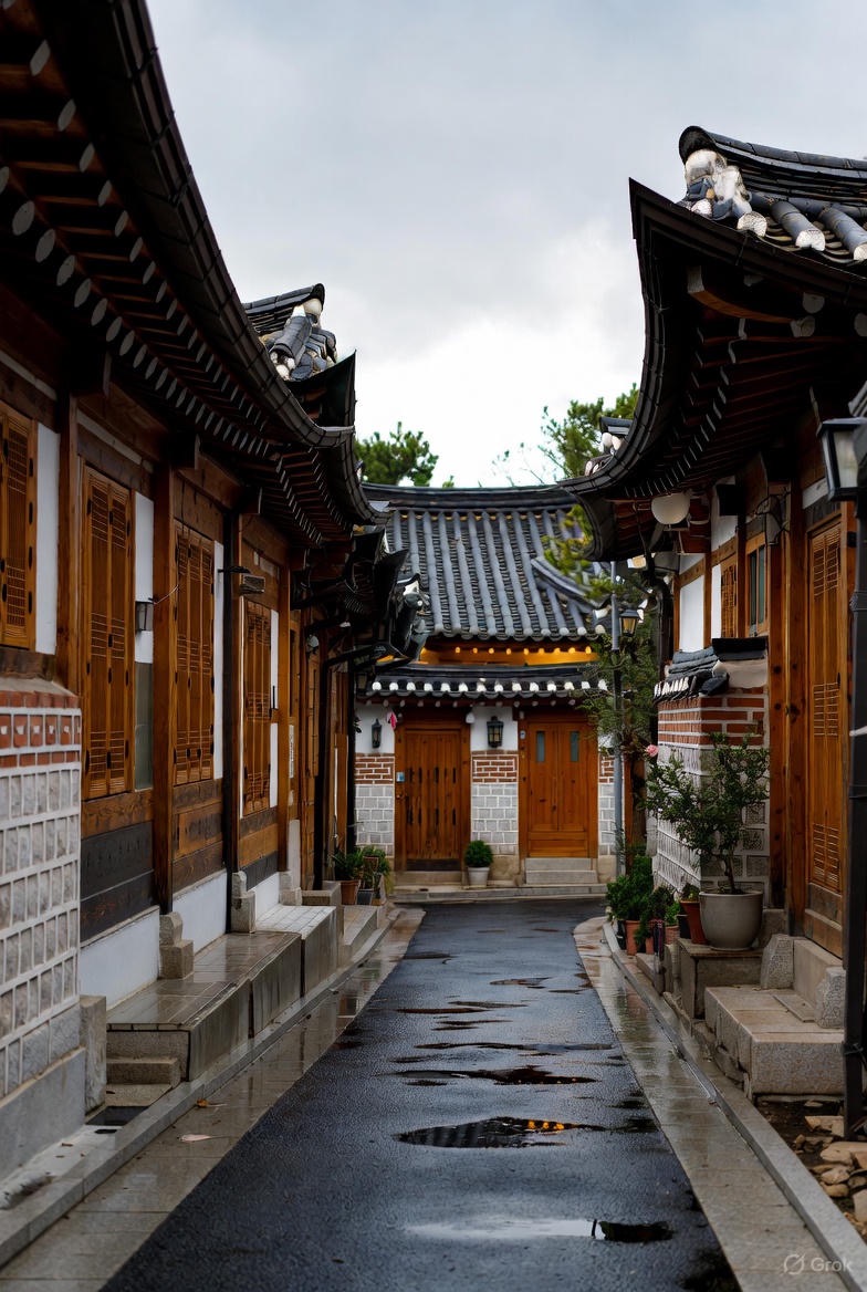 The sound of droplets on hanok roofs, reflections on stone streets, the smell of tea houses steaming in the cold air.